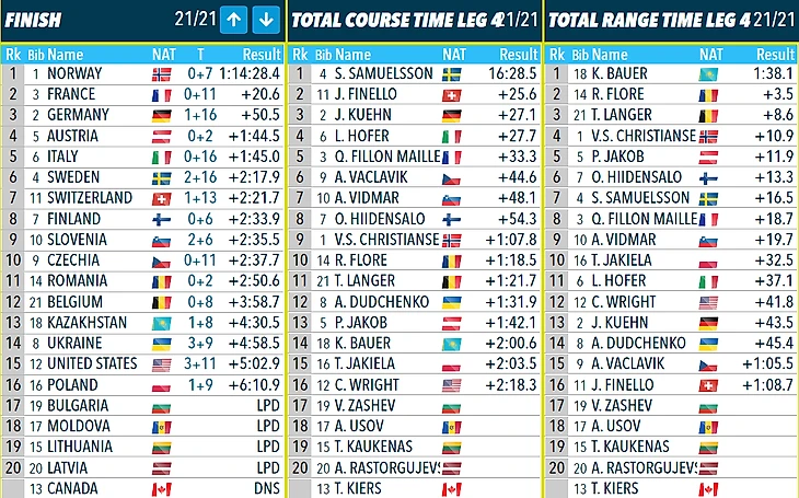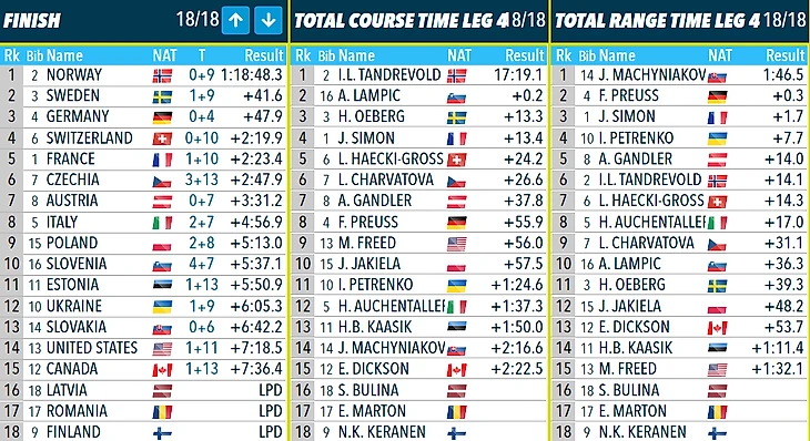 На старте четвёртого этапа продолжилась борьба за восьмёрку между Финляндией, Украиной, Румынией и Словенией, в двадцати секундах от которой была Швеция. На седьмой стрельбе Ветле Шостад Кристиансен был точен, а вот Йоханнес Кюн и Кентен Фийон-Майе закрыли из седьми и восьми соответственно, что ещё сиьнее увеличило и без того комфортный отрыв. Патрик Якоб сохранил свою пятую строчку, а вот Джереми Финелло уступил Лукасу Хоферу, потратив немало времени на рубеже из-за своих промахов. Антон Дудченко ушёл на три круга, выбив Украину из борьбы за место в топ-10. Спокойно прошедший и свой второй круг Кристиансен на седьмом рубеже использовал дополнительный патрон и, закрыв с его помощью мишень, отпраздновал. Кюн уходит на круг, а вот Фийон-Майе стоя безошибочен, благодаря чему Франция вышла на вторую строчку. Якоб тоже не промахивается, когда как и Хофер, и Финелло стреляют, используя максимум дополнительных патронов, но если итальянцу удалось избежать круга, то швейцарцу нет. На стрельбище Себастьян Самуэльссон приехал восьмым и, несмотря на свои промахи, у него получилось отыграть одну позицию, ведь Адам Вацлавик потратил на рубеже много времени. Причём чех теперь и вовсе вне десятки, пропустив вперёд себя финна Хииденсало, словенца Видмара и румына Флоре. И если первая троица финишировала без изменений, то вот Хофер на последнем круге боролся до последнего, с каждой отсечкой нагоняя Якоба и на финише итальянцу не хватило лишь полусекунды. Самуэльссон обыграл Финелло, оформив тем самым камбэк шведов с 18 места на 6.