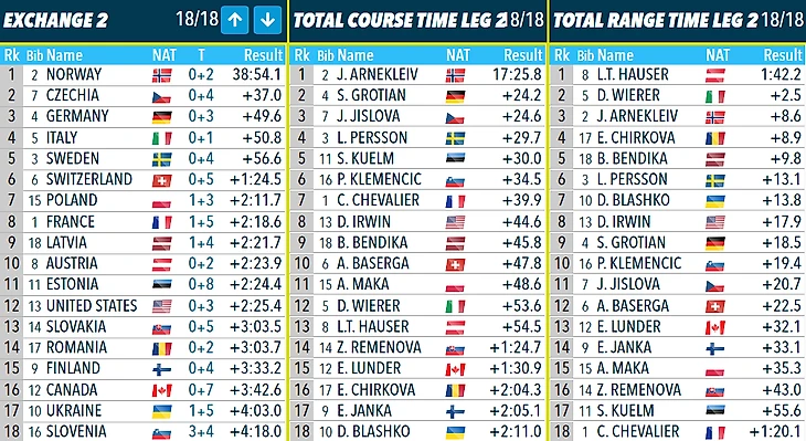 Эмильен Жаклен начал второй этап очень быстро, а Йоша Буркхальтер, наоборот, из-за чего на подходе к рубежу он уже находился в группе преследователей француза. Симон Эдер отработал на рубеже чисто и быстро, выйдя в лидеры по его итогам, немного выигрывая у Жаклена, которому в свою очередь уступали Филипп Наврат, Тарьей Бё, Яков Фак и Шон Доэрти, а вот Буркхальтер взял три дополнительных патрона и уже заметно уступал первой шестёрке. По ходу второго круга Эдера обошли Жаклен, Наврат и Бё, но австрийцу удалось вновь вернулся в лидеры благодаря своей стрельбе, которая снова была быстрой и безошибочной. Филипп и Тарьей, выходившие с рубежа вторым и третьим, на лыжне дуэтом вышли в лидеры, а вот Эмильен, который после рубежа уступал им семь секунд, по ходу последнего круга очень просел по темпу, а последний километр с небольшим и вовсе прошёл на секунду медленнее австрийского ветерана. Словения и США приятно удивляли, завершив первую половину гонки в топ-6. Шведы же на смене этапа были восемнадцатыми, так как Мальте Стефанссон ушёл на ещё один круг в стрельбе в положении стоя, сделав положение хозяев очень тяжёлым.