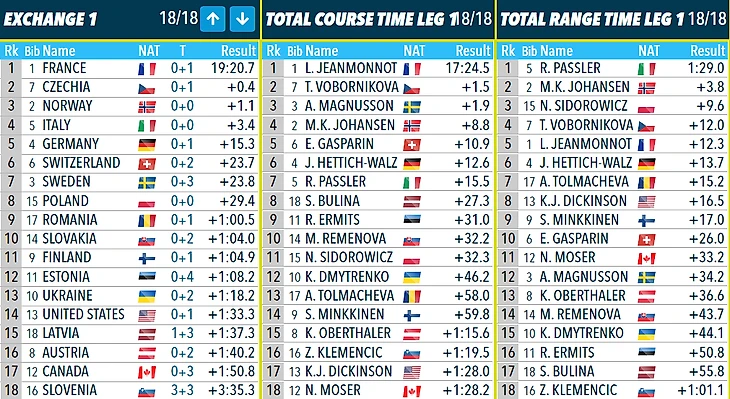 На старте обошлось не без курьёзов: Элиза Гаспарин чуть не споткнулась, зацепившись за чью-то палку, а Надя Мозер и вовсе упала. К первому рубежу в числе лидеров неожиданно подошла латвийская биатлонистка Санита Булина, но возможно этот темп был для неё слишком высоким, ведь по итогу стрельбы она ушла на круг. Из числа лидирующих сборных дополнительный патрон потребовался только австрийке Кристине Оберталер. Ко второму рубежу подходила уже семёрка лидеров, которая после стрельбы немного разбилась: лидировала пара отстрелявших безошибочно Ребекки Пасслер и Марте Крокстад Юхансен, за ними были взявшие по дополнительному патрону Лу Лоран Жанмонно, Тереза Воборникова и Янина Хеттих-Вальц, в эту изначальную семёрку вклинилась Наталья Сидорович, опередившая Элизу Гаспарин и Анну Магнуссон, взявших 2 и 3 дополнительных патрона соответственно. А вот Словения в лице Живы Клеменчич откатилась на последнюю строчку после трёх кругов, уступая предпоследнему месту более полутора минут. К передаче эстафеты ситуация несколько изменилась и итоги первого этапа были следующими: