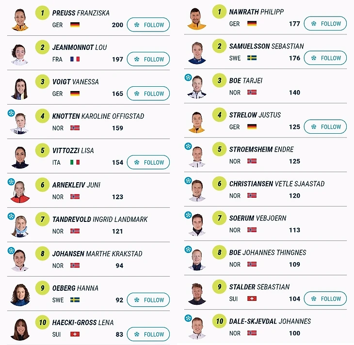 Франциска Пройсс сохранила лидерство, пускай и после своего дубля в связке Лу Лоран Жанмонно отыграла много баллов, которые она проиграла в индивидуальной гонке. Ванесса Фойгт и Каролине Оффигстад Кноттен пока удивляют своим лыжным ходом, который позволил им выбиться в число лидеров зачёта. Несмотря на последствия болезни, Лиза Виттоцци двумя финишами в десятке удержалась в первой пятёрке. И если Ингрид Ландмарк Тандревольд в топ-10 видеть уже привычно, то вот Юни Арнеклейв и Марте Крокстад Юхансен на старте сезона приятно удивляют. Ханна Эберг пока что лучшая из шведок, засчёт своей стабильности, а закрывает десяку Лена Хекки-Гросс.