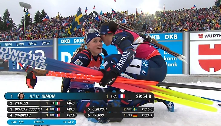На финише Жюлия встречала всех соперниц – поздравляла сама и принимала поздравления. А еще нашла слова утешения для Софи Шово, которая вторую гонку подряд завершила на четвертом месте. Сначала Софи выглядела расстроенной, но после слов Симон улыбнулась.