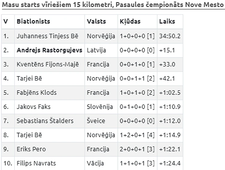 Из латвийских спортсменов медали чемпионата мира до сих пор имел только Илмарс Брицис - две бронзы в 2001 году на индивидуальной дистанции в 20 километров и в 2005 году в спринте на десять километров.