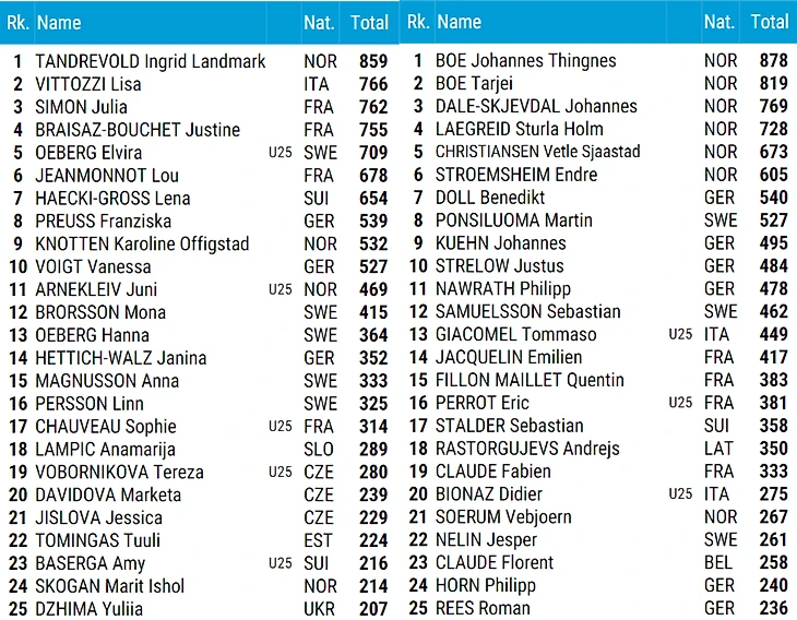 Из лидирующей группы женского биатлона именно Ингрид Ландмарк Тандревольд провела этап лучше всех, благодаря чему немного увеличила свой отрыв, а вот внутри троицы главных преследовательниц Жюстин Брезаз-Буше пропустила вперёд и Лизу Виттоцци, и Жюлию Симон. Эльвира Эберг немного подтянулась к ним, да и не так уж далеко от неё Лу Жанмонно и Лена Хекки-Гросс. Пропустившая же этап Франциска Пройс теперь подотстала от первой семёрки, но и её саму не смогли пройти Каролине Оффигстад Кноттен, пропускавшая индивидуальную гонку, и Ванесса Фойгт.