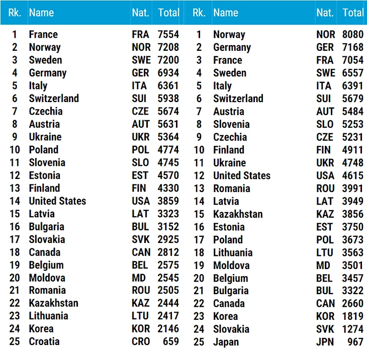 В женском кубке наций Франция, вышедшая в лидеры после чемпионата мира, сохранила свою первую строчку, но дуэт скандинавских стран немного своё отставание сократил, а внутри него Норвегия обратно обошла Швецию. Ещё одно изменение в десятке сильнейших – размен позициями между Чехией и Австрией.А вот у мужчинв кубке наций изменение в первой десятке произошло всего одно – сборная Швеции обогнала сборную Италии в борьбе за четвёртую строчку.