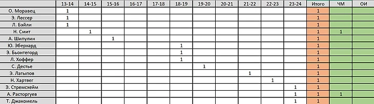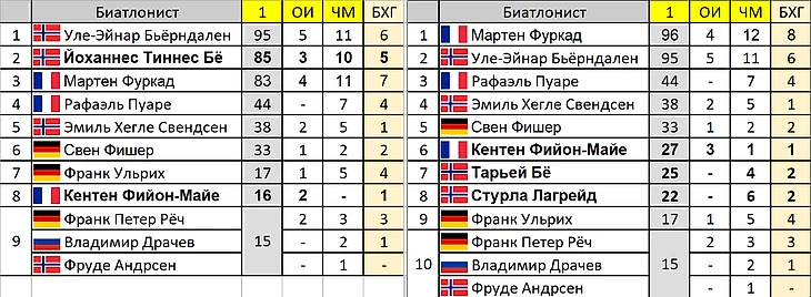 Да, это главный соперник Йоханнеса - великий Мартен Фуркад. Целых 13 побед недосчитался, включая 1 на ЧМ. Старший брат Тарьей Бё, тоже потерял очень много, 12 побед из них 2 на ЧМ. Кентен Фийон-Майе и Стурла Лагрейд - 11 и 9 побед соответственно. При чем Стурла аж 3 личных золота ЧМ недополучил. Лично для меня, стало большим сюрпризом, что Эмиль Хегле Свендсен ни разу не был вторым вслед за Йоханнесом. Что же изменилось бы в распределении главного трофея сезона - Большого Хрустального Глобуса?