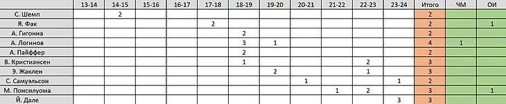 Далее у нас список биатлонистов, которые не досчитались 2-4 золотых наград: