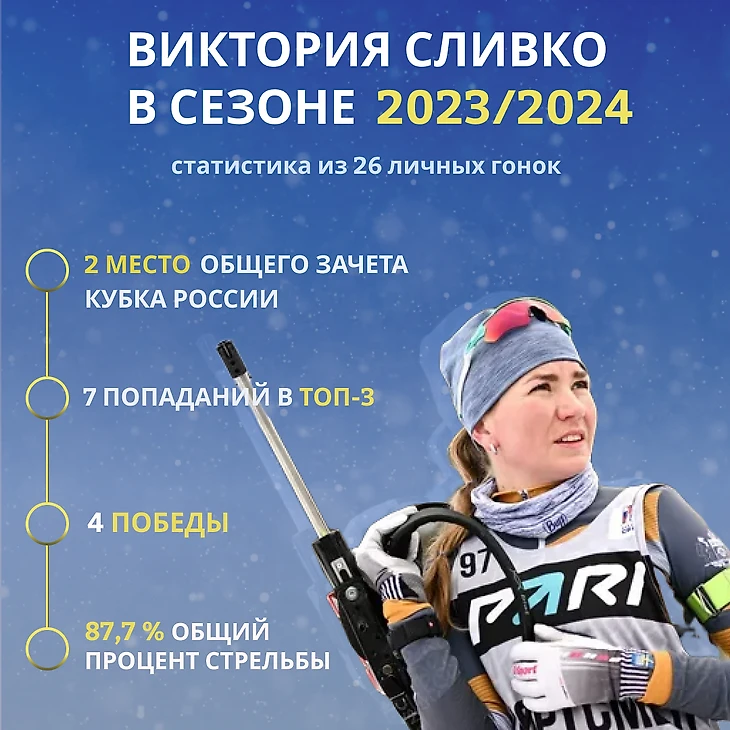 Для Виктории Сливко этот сезон начался не так успешно, как для Тамары Дербушевой. На первом этапе Кубка России в Ханты-Мансийске она смогла войти в топ-6 лишь один раз, но к середине декабря на этапе Кубка Содружества в Уфе она смогла разогнаться и вместе с Дербушевой собрать целый урожай наград: 3 победы и 1 бронзовая медаль на двоих, а также все личные гонки в топ-5 для Виктории.