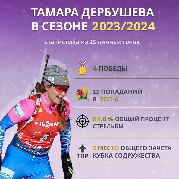 Казалось, что главный претендент на золотую медаль на Спартакиаде-2024 в Златоусте уже был определен, и сама спортсменка признавалась, что этот старт является для нее самым важным, и нужно сохранить все силы именно для этих соревнований. Однако в середине января Дербушева заболела, что очень сильно повлияло на ее форму и психологическое состояние. За месяц до Златоуста она заметно потеряла в функциональном плане, а стрельба в ответственный момент не сдюжила. В итоге на Спартакиаду Дербушева приехала не в лучшей форме, но все же смогла зацепиться за золотую медаль.