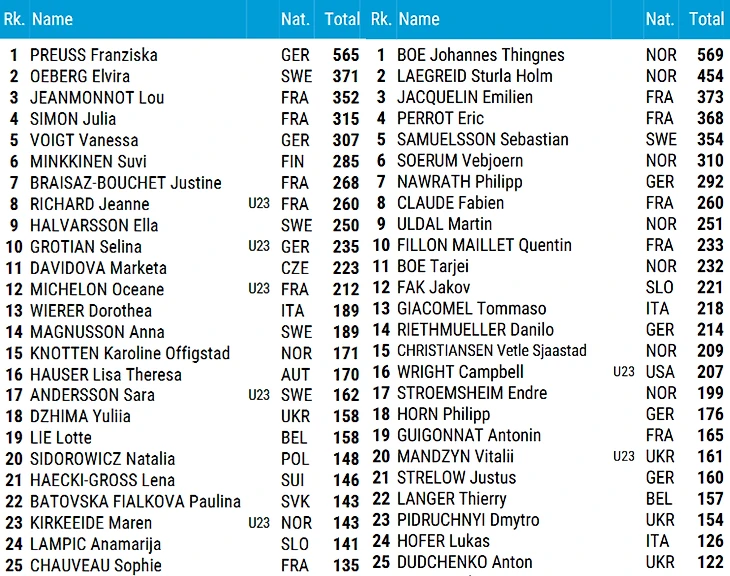 Франциска Пройс провела еще один отличный этап и оторвалась от преследовательниц. Эльвира Эберг обошла Лу Жанмонно, а за ними теперь Жюлия Симон, поднявшаяся на пять позиций. Ванесса Фойгт хоть и пропустила масс-старт, но осталась пятой. Суви Минккинен поднялась на шестое место, а за ней теперь дуэт попавших в десятку француженок Жюстин Брезаз-Буше и Жанны Ришар, ставшей лидером зачета до 23 лет. Элла Хальварссон опустилась на девятую строчку, а Селина Гротиан поднялась в десятку лучших. Свое лидерство упрочил и Йоханнес Тиннес Бе, но Стурла Холм Лагрейд не настолько далеко. Эмильен Жаклен, Эрик Перро и Себастьян Самуэльссон остались при своих, разве что эта группа стала плотнее. Вебьорн Серум поднялся на два места, Филипп Наврат сохранил свою позицию, равно как и Кентен Фийон-Майе. А между ними расположились поднявшийся на одно место Фабьен Клод и ворвавшийся в десятку Мартин Ульдаль.