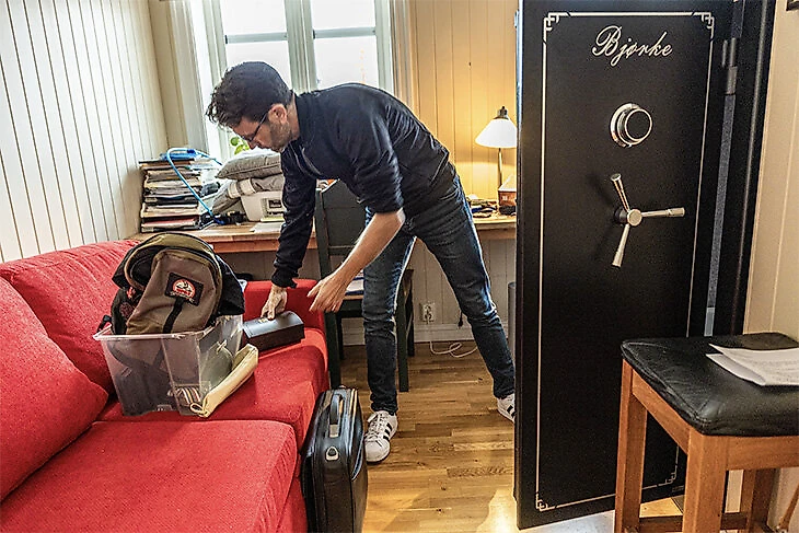 Бьорндалену приходится немного напрячься, чтобы засунуть пластиковую коробку в сейф, после чего он кладет сверху рюкзак и сумку для ноутбука.