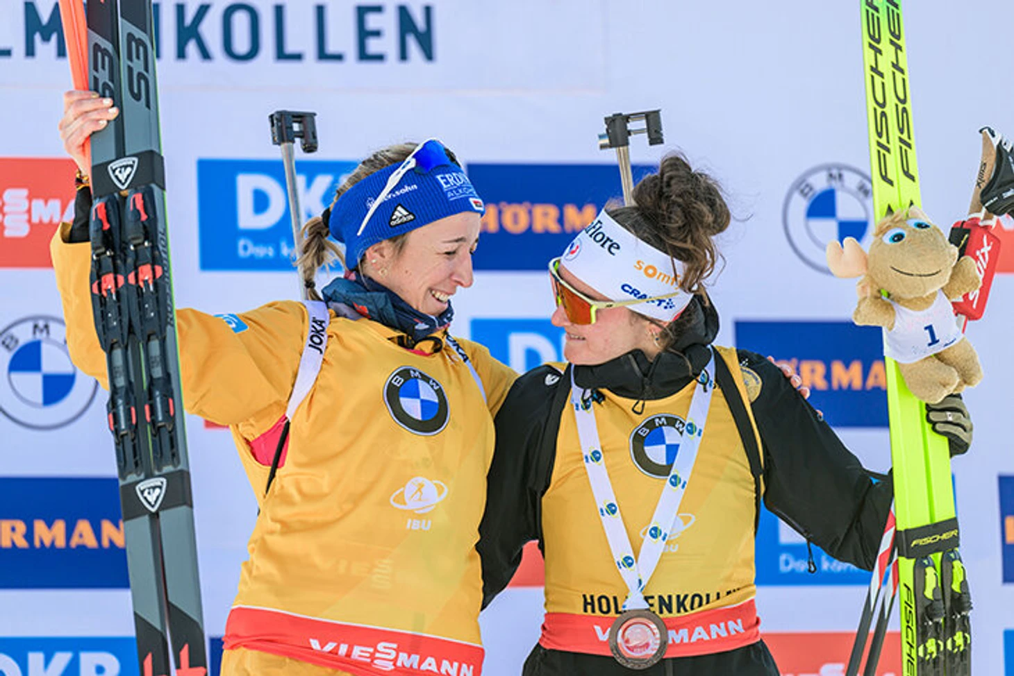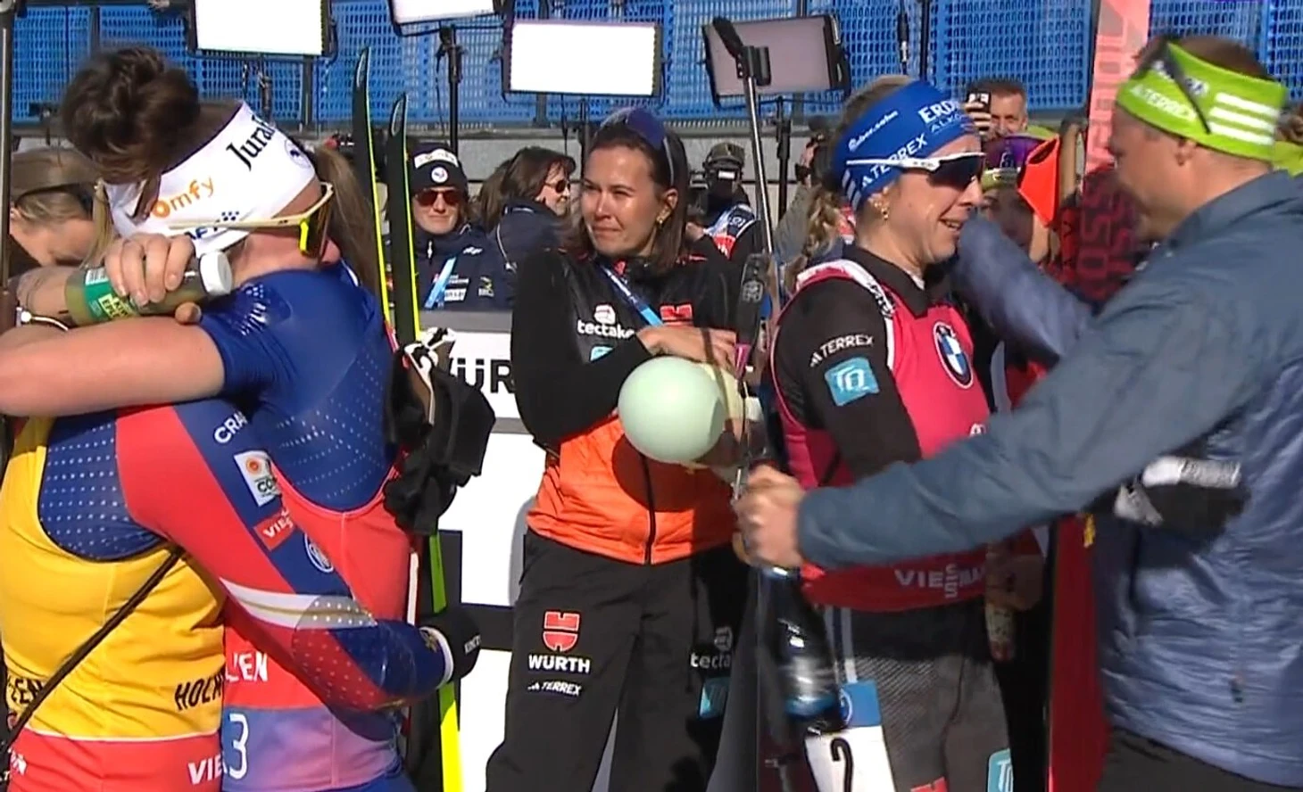 На награждении Пройс вернули желтую майку лидера – она пробегала в ней почти весь сезон, но будто бы для обострения интриги отдала ее Жанмонно на этот масс-старт. Франциска тут же позвала Лу к себе на первую ступеньку – так и стояли рядом в двух желтых майках.