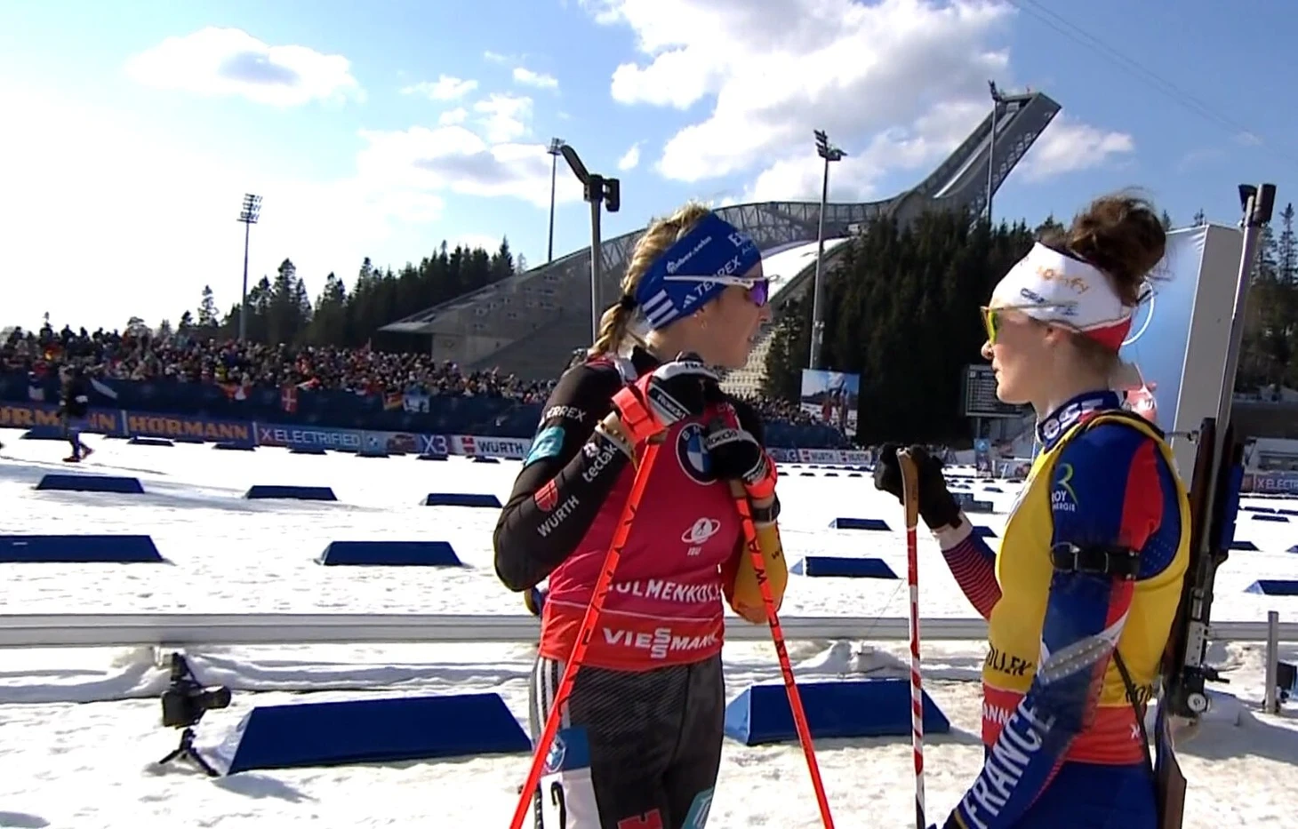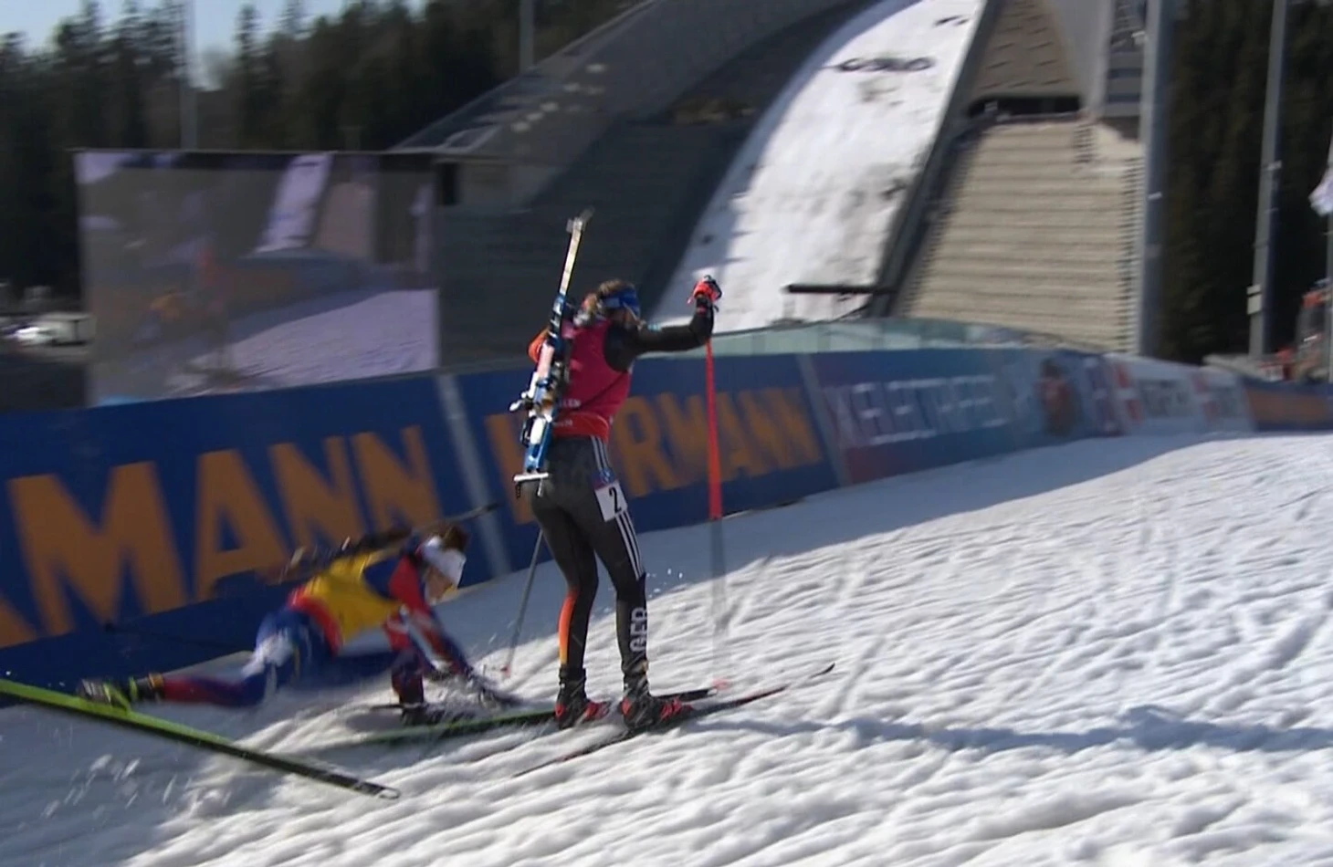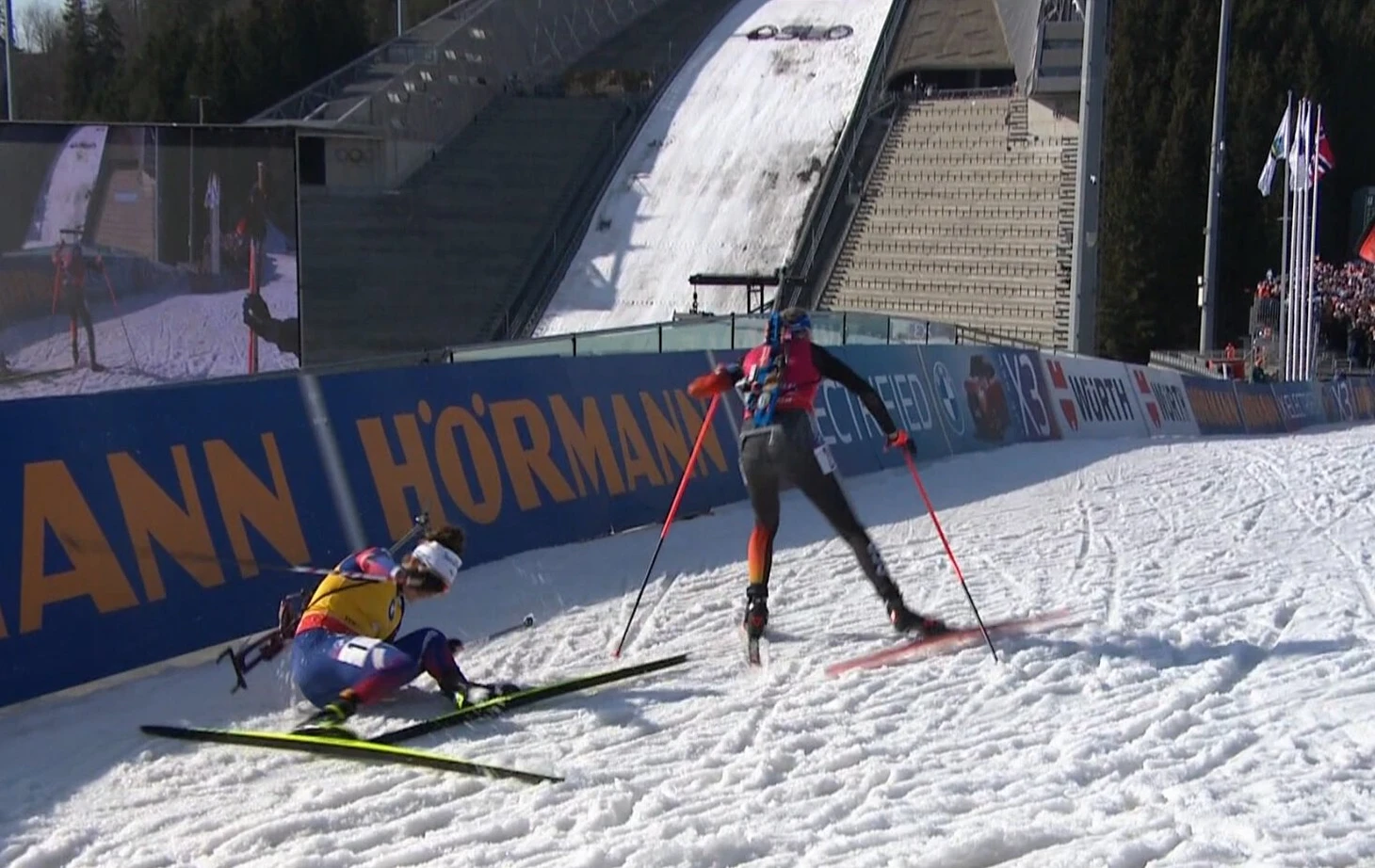 На повторе видно: контакта между биатлонистками не было. Жанмонно зацепилась за ограждение и упала сама.