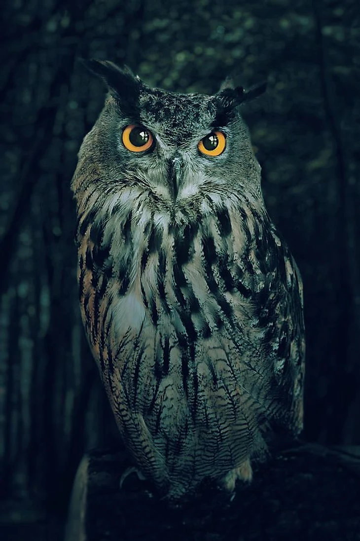 Филин сидит среди ветвей,