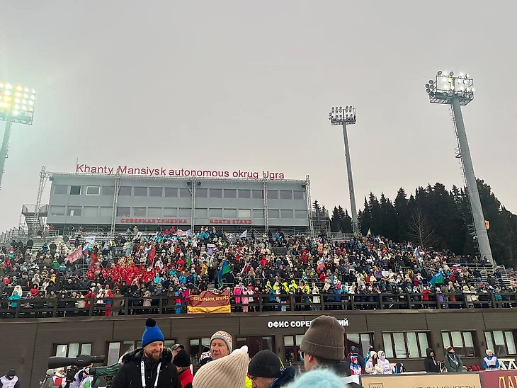 1. Оба дня центральная трибуна нормально заполнялась. Были и дети, и фанаты, которые топят за биатлон с начала 2000-х, и приезжие из других городов. Люди приходили с флагами, дуделками, плакатами. Это точно не сумасшедший аншлаг, но вполне бодренько и атмосферно.