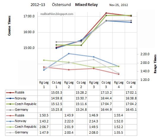 Общие впечатление от эстафеты - хорошее. По сути можно выделить всего 2 проблемных места. Это необычно низкий темп Бахманн и застрел Лессера.