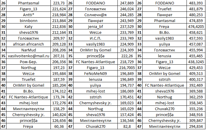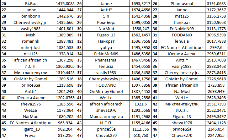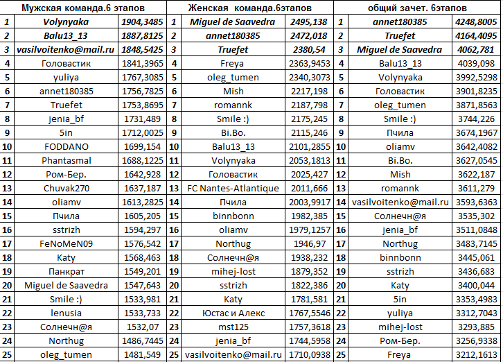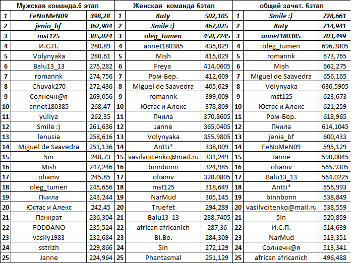 Мужская команда: https://docs.google.com/spreadsheet/ccc?key=0AvGDXLwZXR5WdGtsVG5KMzVGU0Vhck0zQXpBMFVNMHc#gid=0
