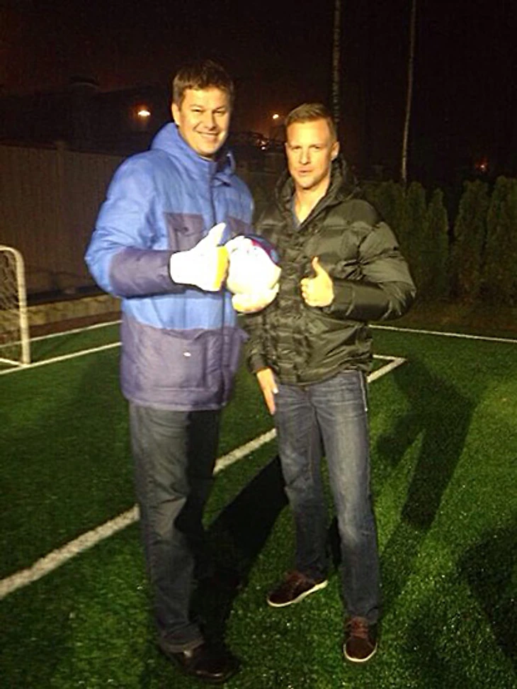 Мы пообщались, я принес биатлонные подарки его супруге и детям. К моей огромной радости Вячеслав тоже подарил мне подарок – вратарские перчатки с эксклюзивным автографом. И под занавес нашей беседы мы вышли на миниатюрное футбольное поле и Слава пробил пенальти примирения, а я в красивом броске поймал этот мяч.