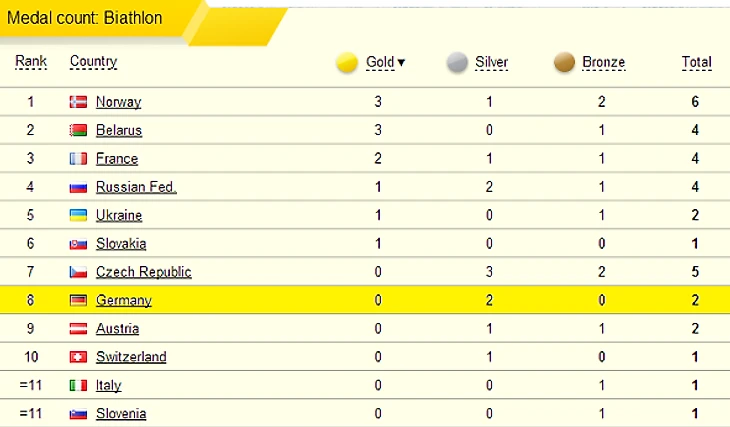 Итак начнем с Биатлона. Так выглядит медальный зачет, только 8 место сборной Германии.