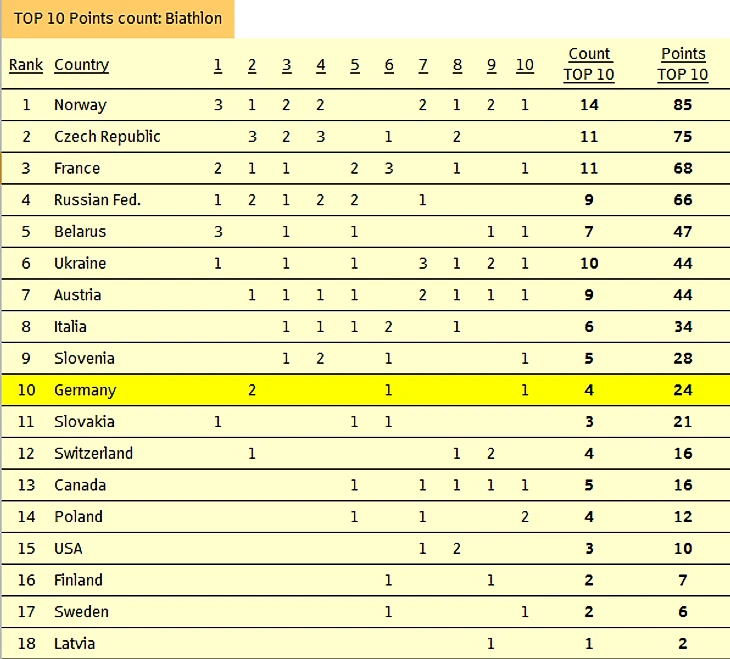 Альтернативный командный зачет (по очкам, за каждое 1 место страна получает 10 очков, за 2 - 9 и так далее , за 10 место - 1 очко) показывает еще более удручающую картину. всего 4 попадания в ТОП-10 и 10 место.