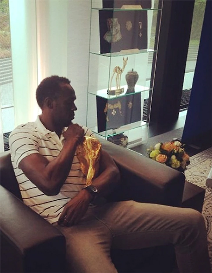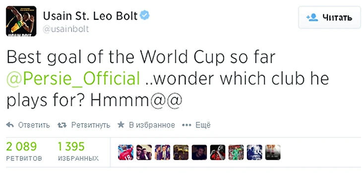 Усэйн, как и на дорожке, чуть запоздал со стартом и пропустил открытие чемпионата мари. Зато один из ярчайших матчей не прошел мимо него. Легендарный гол Робина Ван Перси в ворота Испании ямаец смаковал с иронией, попутно напоминая, за какой клуб он болеет