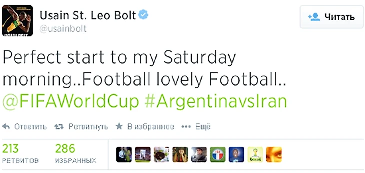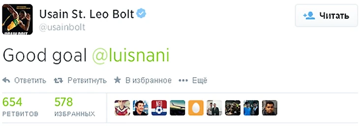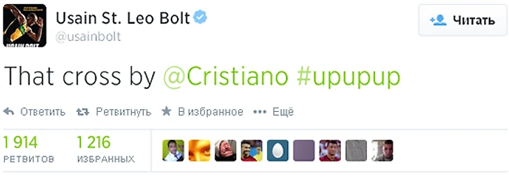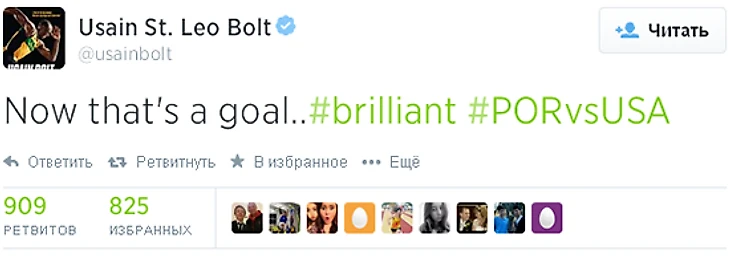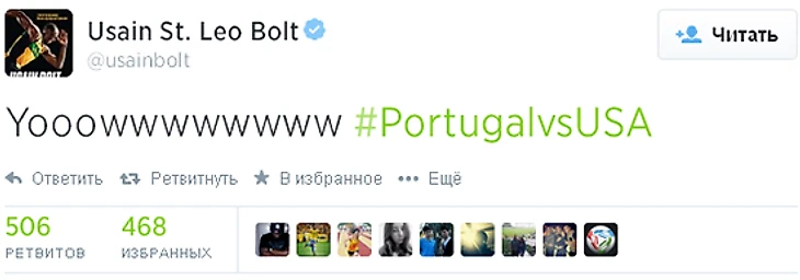 Тоску ямайца через пару часов разгоняли португальцы с американцами. За время игры Усэйн сделал пять твитов, похвалил за гол Нани и Джонса, а Роналду за результативную передачу.