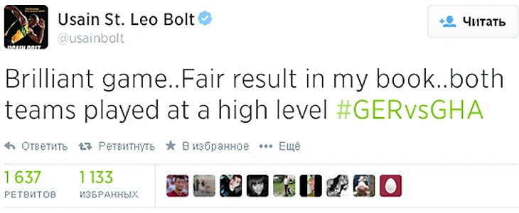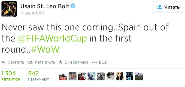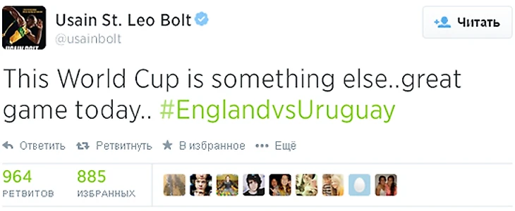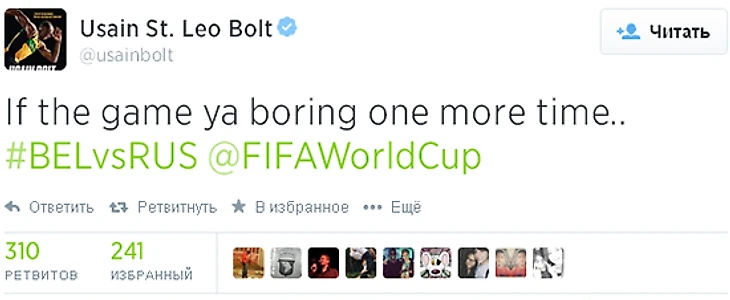 «Ретвитни, если скучаешь под Бельгия – Россия». Усэйн Болт смотрит ЧМ-2014