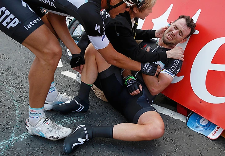 Марк Кэвендиш, конечно, сам виноват. Бодание соседей по пелотону за несколько сотен метров до финиша – его давня фишка. Без нее, пожалуй, не случилось бы значительной части из 25 побед на этапах «Тур де Франс» и многих других радостей. Но если на скорости за 70 км/ч с усилием кладешь голову на плечо едущему рядом, надо быть готовым к тому, что он не струсит, не подвинется – и по асфальту размажет вас обоих.