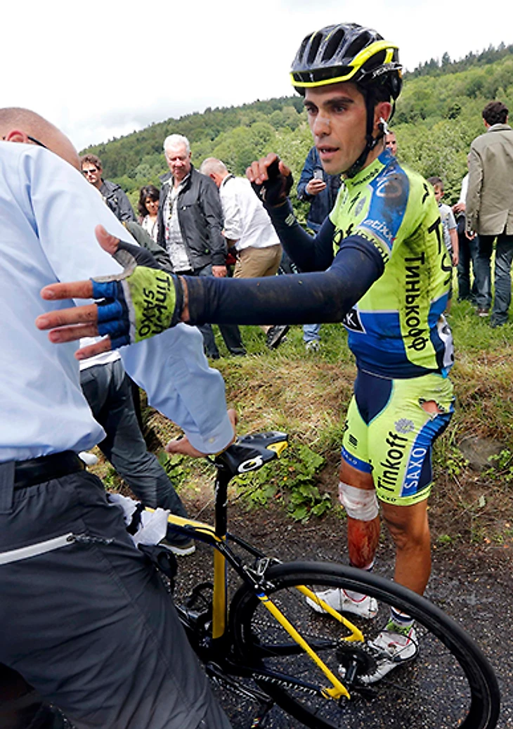 Сегодня из игры выбыл двукратный победитель и, пожалуй, главный фаворит «Тура» (учитывая его репутацию горняка и россыпь горных заездов в ближайшие две недели) Альберто Контадор. Сначала было ощущение, что залитая кровью голень – просто эффектный штрих к ушибу.