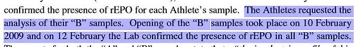 Процесс вскрытия допинг-проб жестко регламентирован и документируется. Во время вскрытия присутствовали адвокаты, которые хорошо знают технические нюансы – конечно, ошибка была бы использована. Подтверждение о положительных пробах «Б» было сделано сразу же, а не спустя две недели.