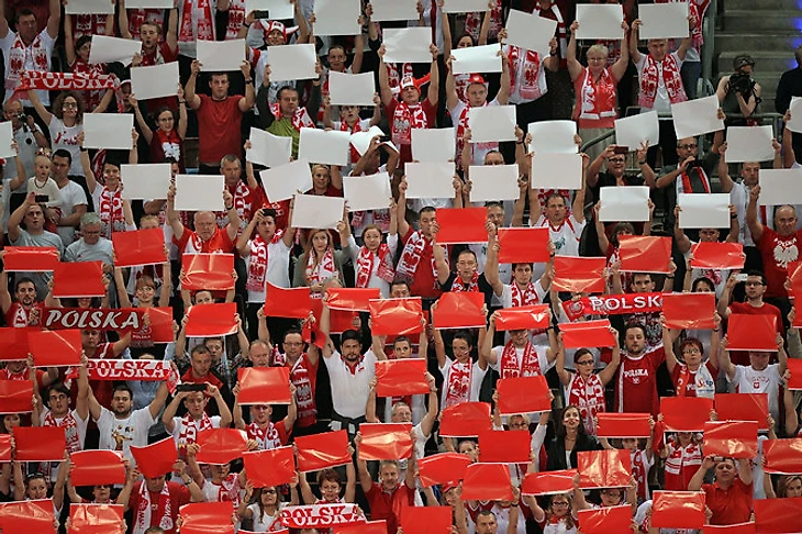 21.30 Всем привет! На Sports.ru – большой волейбол: чемпионат мира, Россия – Польша. Старт – в 22.25 по московскому времени, но 14-тысячная Atlas Arena в Лодзи уже под завязку забита такими вот бравыми панами: