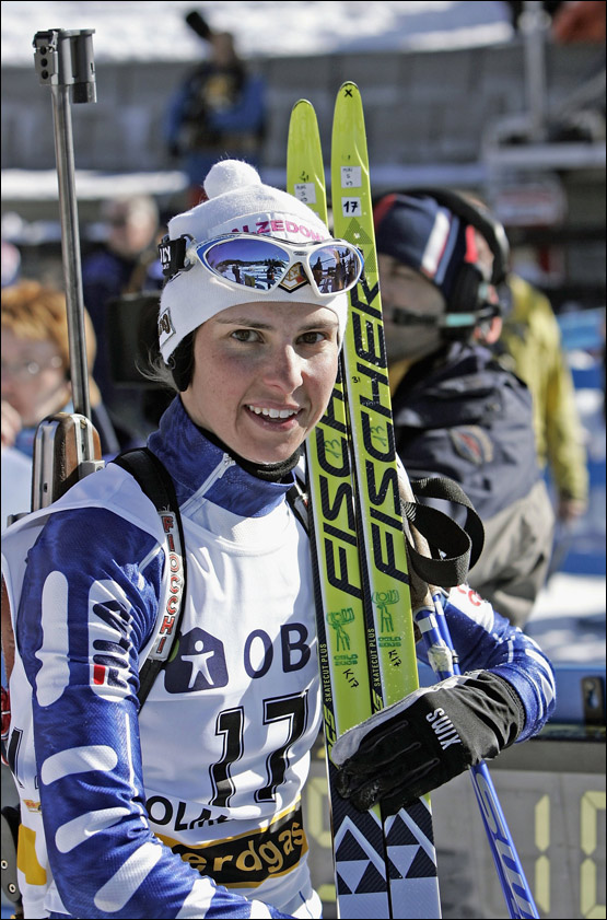 А вот собственно и Сандрин Байи, одна из лучших биатлонисток того времени с кубком мира