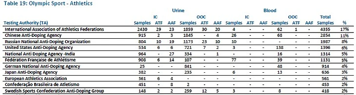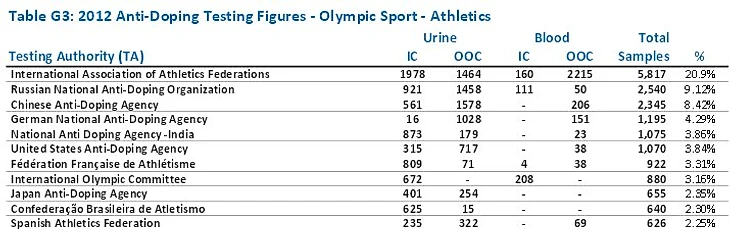 Как видно из таблицы, в легкой атлетике в 2013 году по количеству проб на первом месте среди национальных федераций находился Китай (2854), у России на втором месте меньше двух тысяч (1987), США отстают от России на 600 проб.
