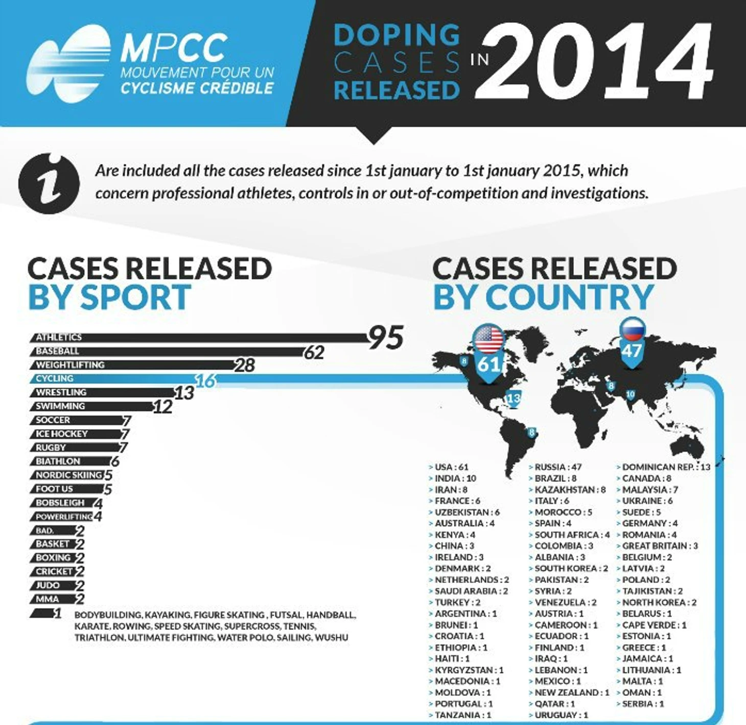 В дополнение к этим таблицам еще одна, от "Движения за чистый велоспорт" (MPCC). Здесь собраны допинговые случаи во всех видах спорта в 2014 году. Не уверен в абсолютной точности данных, но тенденция отражена верно, так как США и Россия находятся в "лидерах" по использованию допинга в мире. Примечательно, что на втором месте среди видов спорта стоит бейсбол.