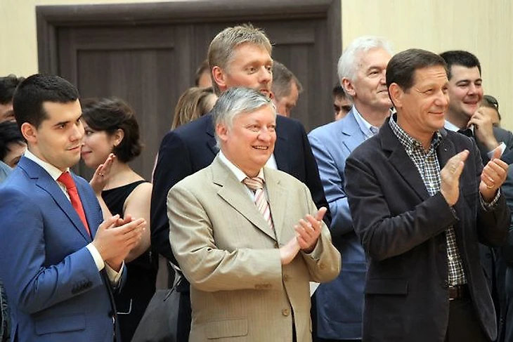 Пресс-секретарь Президента РФ Дмитрий Песков (на фото в центре, за Анатолием Карповым) – председатель Попечительского совета Российской шахматной федерации