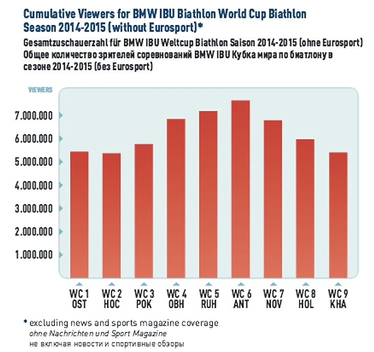 Без Eurosport. Важное уточнение: средний рейтинг биатлона не учитывает данные канала Eurosport, который транслирует все гонки Кубка мира и чемпионата мира. Стало быть, цифры в любом случае выше.