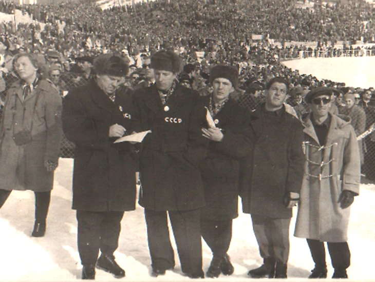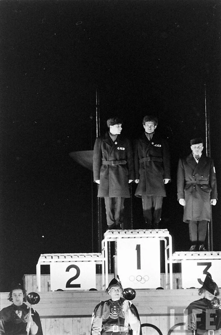 Здесь изображены, в частности, тренер советской хоккейной сборной Владимир Егоров и его воспитанники – Виктор Шувалов (кстати, единственный доживший до сегодняшнего дня наш победитель тех Игр) и Юрий Пантюхов.