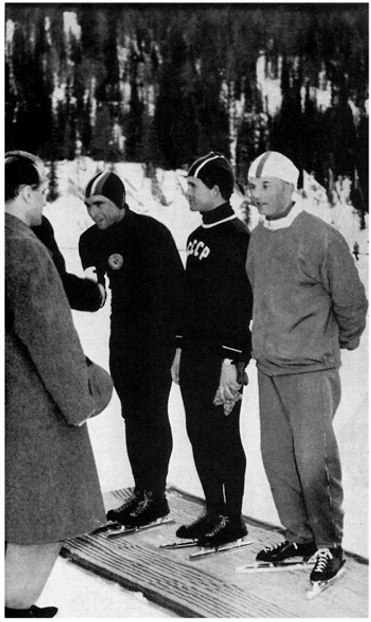 Спортивная форма, как и пальто, была тёмно-синего цвета. А рукавицы (в руке у Грача), шарфики и шапочки уже тогда несли на себе национальный красно-белый орнамент. Особенно хорошо это видно вот здесь, где других наших конькобежцев – Бориса Шилкова и Олега Гончаренко – «разделил» швед Сигвард Эрикссон: