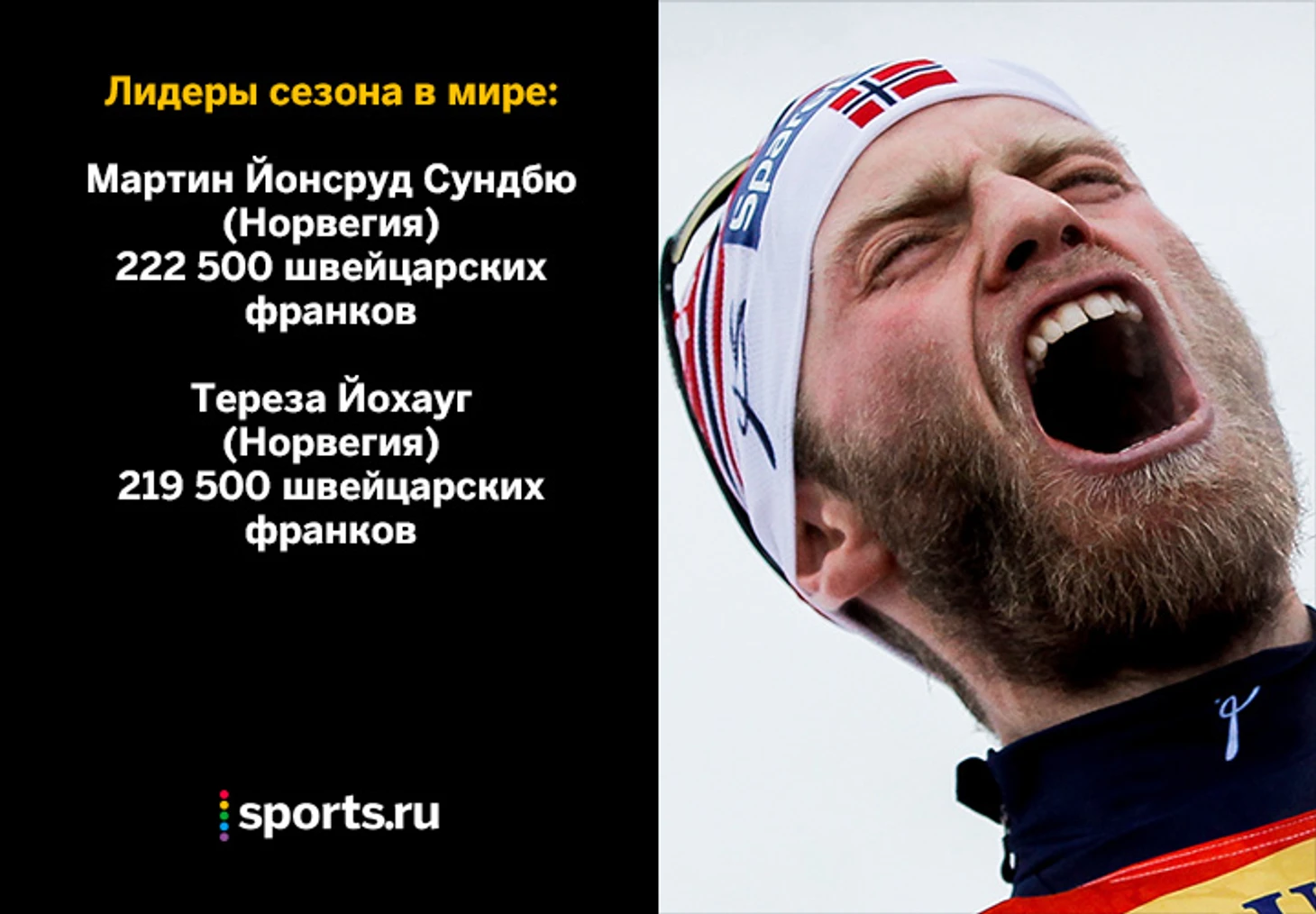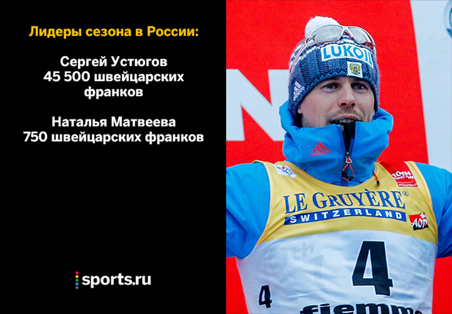 Все гонорары от FIS (Международной Федерации лыжного спорта) в швейцарских франках (1 франк = 0,924 евро или 64,5 рубля по курсу FIS)