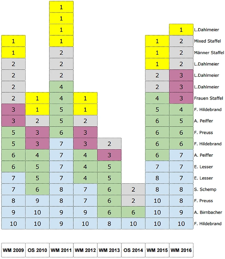Вот так в цифрах выглядят достижения немецких биатлетов на Чемпионате Мира 2016 в сравнении с Главными Стартами прошлых лет.Для удобства справа отмечены спортсмены, которые "забежали" в топ-10.