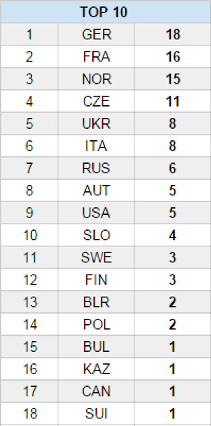 Это хорошо характеризует следующая статистика. Немецкая сборная была не в лучшем своём состоянии, даже Лаура Дальмаер, завоевавшая 5 медалей, на мой взгляд находилась не в лучшей своей форме. Из других сборников, разве что можно выделить Эрика Лессера, который наверное был очень близко к оптималу, остальные же явно не смогли (кто и по объективной причине) набрать форму к ЧМ. Но даже в такой форме немцкая сборная больше всех на ЧМ забегает в ТОП-10.
