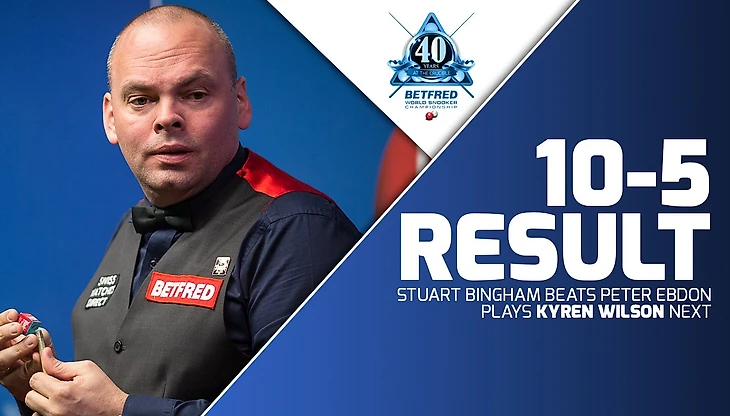 Несмотря на упорную первую сессию, во второй Стюарт сумел взять инициативу в свои руки и в итоге одержал довольно уверенную победу. Эбдон вел со счетом 61:0 в 10-м фрейме и мог сравнять счет в матче, однако Бингхэм сделал брейк в 62 очка и увеличил свое преимущество, которое больше так и не растерял. Таким образом, самый опытный участник чемпионата мира покидает турнир, а Стюарт Бингхэм становится пятым участником 1/8 финала, где он сыграет с Кайреном Уилсоном.