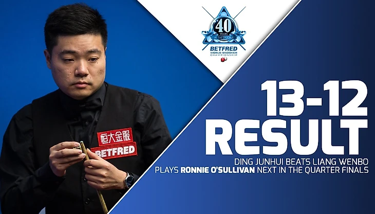 Сумасшедший матч выдали два лучших китайских снукериста. После первой сессии Дин вел со счетом 6:2. Вторую сессию со счетом 5:3 выиграл Лян и счет стал 9:7 в пользу Джуньху. Затем Веньбо даже удалось выйти вперед 10:9, 11:10 и 12:11, но концовку его соперник провел лучше. В общей сложности Лян сделал 1 сенчури и 11 полусотен, на счету Дина 3 сотни и 7 брейков за 50 (в том числе заход на максимум, который оборвался на отметке 80 очков). В четвертьфинале Джуньху сыграет с О’Салливаном.