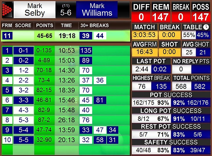 Первый же матч турнира получился лучшим матчем всего первого раунда. Уильямс начал матч очень бодро и повел 2:0 с серией 135 очков в первом фрейме, сразу начал оказывать на Селби давление. Селби еще не нашел свою лучшую игру и в таких случаях он затыгивает соперников в позиционную игру, играет аккуратно, по шансам. И казалось, что именно таким образом он перевернул матч, сделав счет сначала 3:2 уже в свою пользу, а потом и вовсе 5:3. При этом надо сказать, что тут оба играли очень хорошо. У Селби были шансы выиграть матч со счетом 6:3, то Уильямс уцепился в свою возможность победить и сделал счет 5:4, а потом и 5:5. Решающий фрейм стал настоящей драмой. Соперники по очереди были фаворитами на победу, а развязка наступила на последнем красном. Забивает его Селби и простая концовка остается для него, не забывает - тогда шар остается в лузе и Уильямс собирает простую концовку. Красный располагался на середине черного борта, Селби немного неточно вышел на него, и перерезал на несколько миллиметров. Итог 5:6 в пользу валийца.