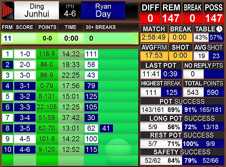 Это был крайне интересный матч. В начале Дин повел 3:0 и казалось, что с такой игрок Дэй не возьмет больше 1-2 фреймов. Но потом Дин почти в один момент рассыпался, а валиец невероятно преобразился. Дин начал ошибаться и уходил в свое кресло с опущенной головой, без какой-либо искры в глазах и просто смотрел как соперник берет фрейм за фреймом. Дин за весь матч совершил всего 9 дальних ударов, забив 5 из них. 5/9 кажется неплохим показателем, но Дин как будто боялся их играть, а дальние Дэя 13/18. Он не боялся их играть да еще и забивал их. После того как счет стал 3:3 в концовке 7 фрейма Дин совершиет мисс-кью и дает свободный шар Дэю, который разыгрывает концовку и вызодит вперед. Далее в 8 фрейме Дин провел серию в 62 очка, но все равно проиграл. Дэй выиграл 5 фреймов подряд, а потом довел матч до победы. Игроки на двоих сделали 5 сотенных серий, но при этом в матче было достаточно и ошибок и нервных концовок.