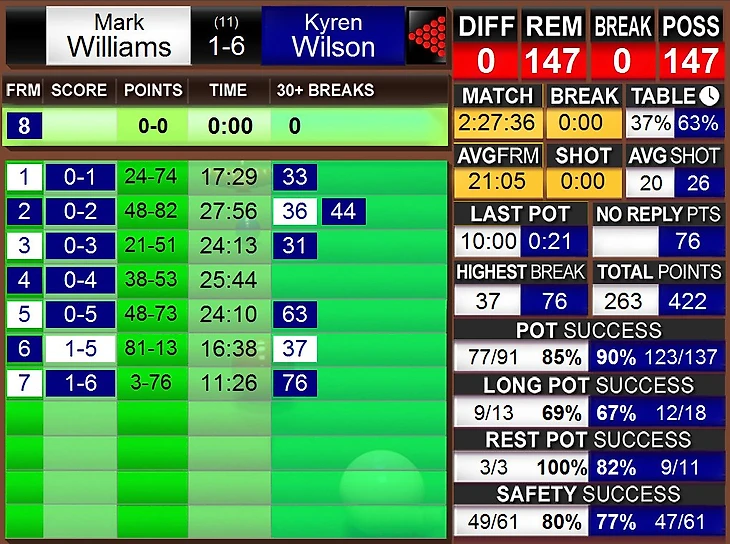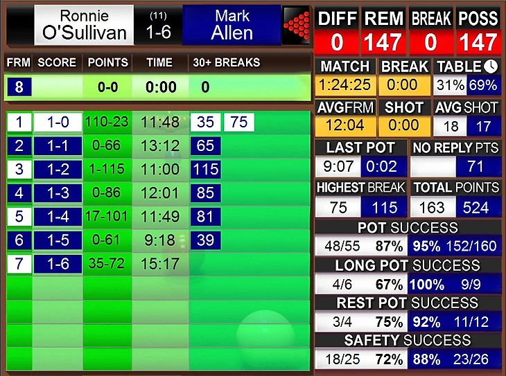 Статистика подтверждает, что Аллен провел выдающийся матч. 9/9 в дальних, 95% процентов результативность + еще в отыгрышах большой перевес, хоть и не они тут решали. В итоге посыпался не Аллен, а Ронни. Англичанин закончил матч с результативностью 87% и 72% в отыгрышах.