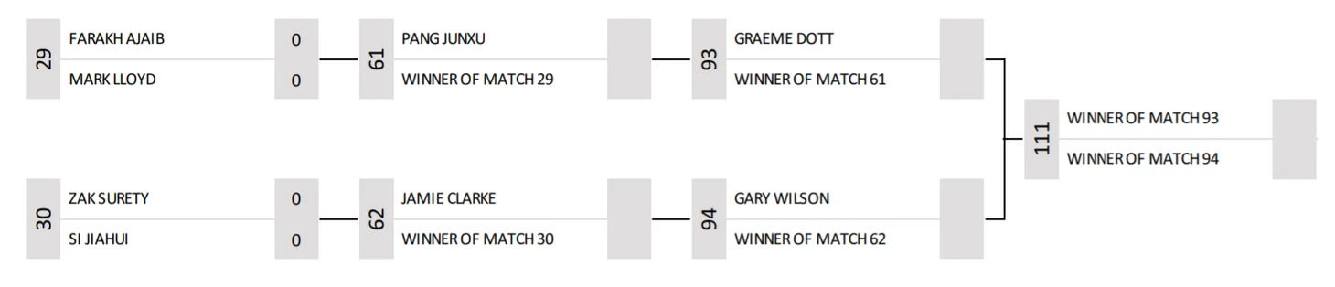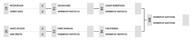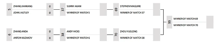 Этот сектор квалификации свёл двух неудачников сезона – Стивена Магуайра и Чжоу Юэлуна. Стивен будет проходить отбор впервые с ЧМ-2018, и в его успехе есть большие сомнения. То же можно сказать и про Чжоу Юэлуна, для которого лучшим результатом в сезоне стал четвертьфинал уже столь далёкого British Open. Но слишком грозных противников у Магуайра и Чжоу нет – следующими по посеву идут Санни Акани и Энди Хикс. Если душа просит сенсацию, здесь её теоретически можно ждать в виде прохода в основную сетку Чжана Аньды, который в первом круге встретится с Антоном Казаковым.