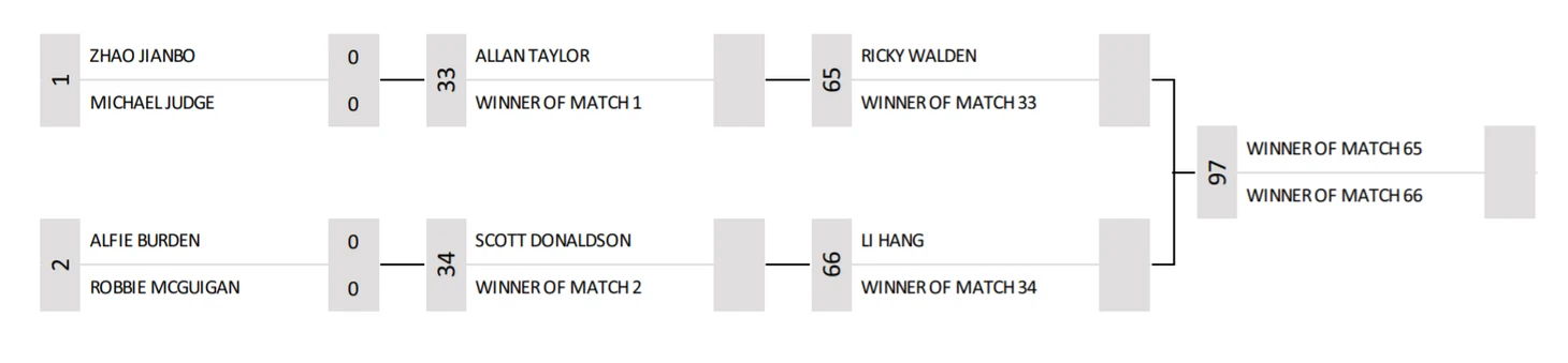 Рики Уолден – первый сеяный квалификации. В прошлом году так же в шаге от основной сетки был Чжоу Юэлун, который в Крусибл так и не попал, проиграв в финальной стадии квалификации. Однако в успехе Уолдена сомневаться не приходится: Рики проводит лучший сезон в карьере, а из сложных соперников у него на пути разве что Скотт Дональдсон. Шотландец, к слову, может провести интересный матч с любителем Робби Макгиганом, победившим на последнем этапе Q Tour.