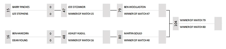 Сектор квалификации, который может подарить зрителям очень приличные матчи. По посеву в третьем раунде здесь намечаются поединки Бен Вулластон - Джо О’Коннор и Мартин Гулд - Эшли Хьюгилл. Андердоги О’Коннор и Хьюгилл умеют навязать борьбу, но проход любого из них в Крусибл будет большой неожиданностью. В более вероятном сценарии, при котором путёвку поделят Гулд и Вулластон, фаворитом видится Вулластон, показывающий в конце сезона более убедительные результаты, чем Гулд.