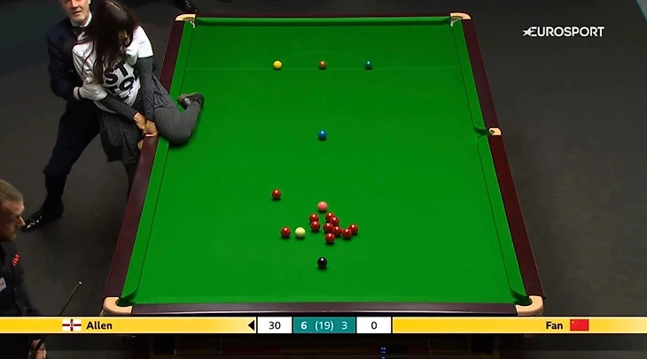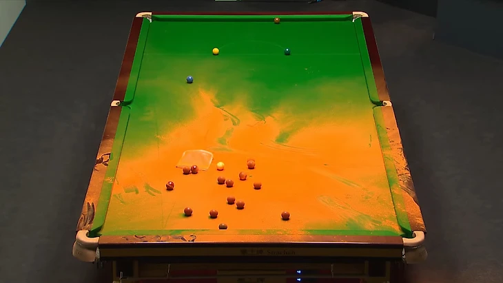Экоактивисты сорвали игру на ЧМ по снукеру: один испортил стол оранжевой краской, вторую от лузы оттаскивал судья