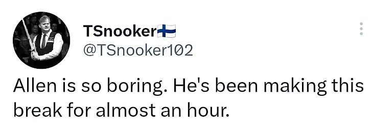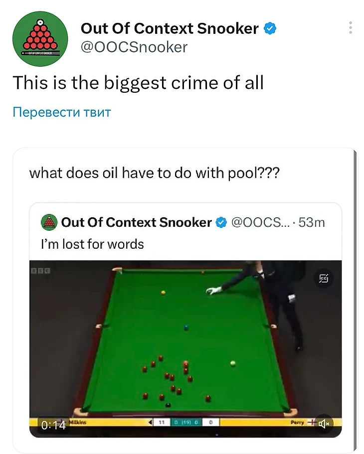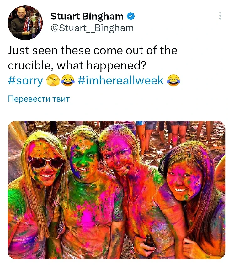 В прошлом году на чемпионате мира всех шокировал голубь в Крусибле, ставший главным мемом, а конкурс на этот год, похоже, закрыт уже на третий день. Происшествие оранжевого цвета повлекло за собой кучу мемов от игроков, журналистов и снукерных твиттерян. Напоследок – подборка лучших шуток на тему.